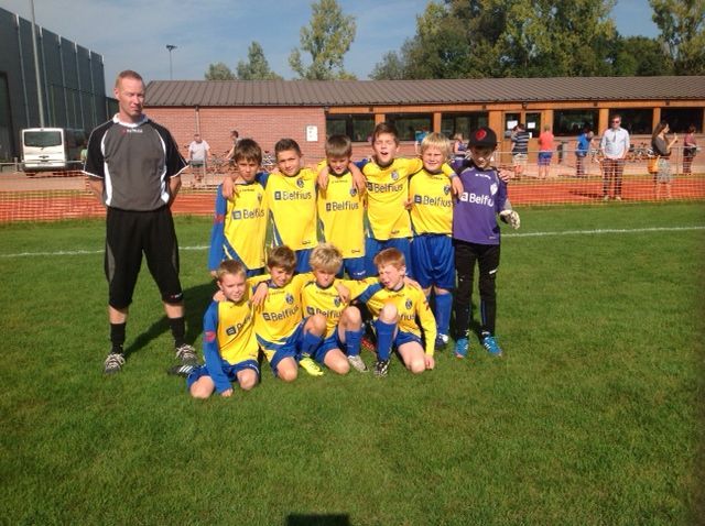 bovenaan, van links naar rechts trainer Bart, Niel, Kylian, Lars Houpeline,Ward, Senne en Lars Lambrecht